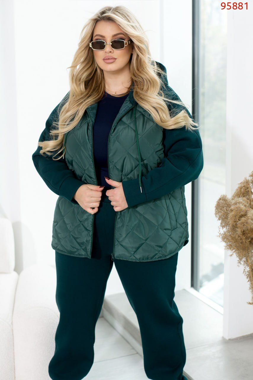 Спортивний костюм із кофтою на змійці, пошитий із поєднання тканин "стежка" та трьохнитки, створений для комфорту та стилю. Кофта оснащена капюшоном зі шнурком, що проходить через люверси, забезпечуючи захист і регулювання. Спереду розташовані врізні кишені для зручності. Рукава з трьохнитки з манжетами забезпечують комфортну посадку. Штани з високою посадкою на еластичній гумці з боковими кишенями і манжетами внизу додають функціональності та забезпечують тепло. Ідеальний вибір для активного відпочинку чи повсякденних занять.
