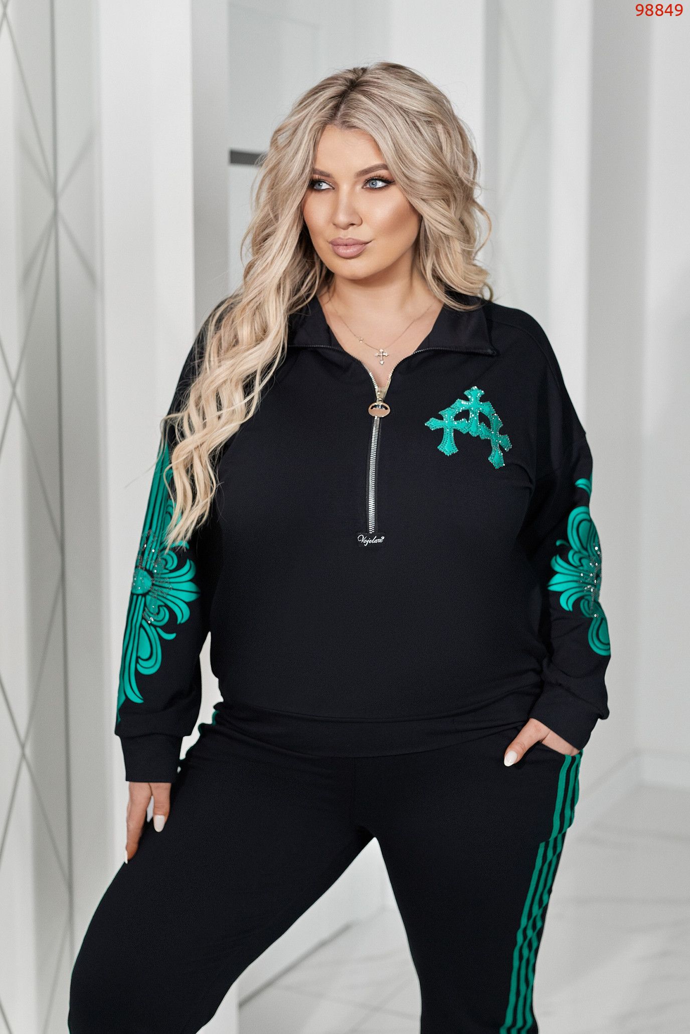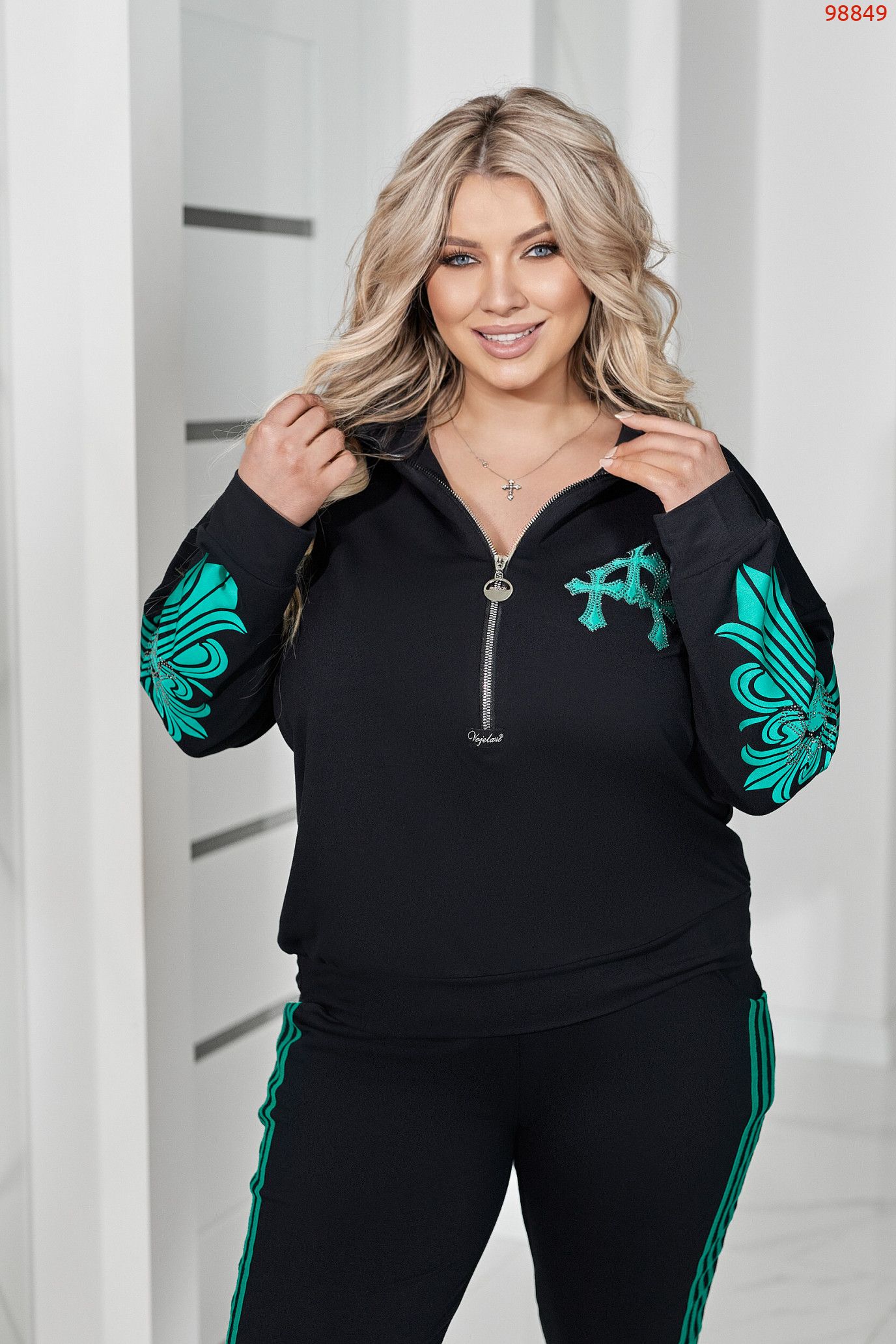 Кофтинка вільного покрою зі стійкою комірцем — зручна та сучасна. Модель декорована аплікацією з тканини, оздобленою стразами DMS, що додає образу яскравого та стильного акценту. Рукава прикрашені апплікацією, яка підкреслюють спортивний модний та сучасний стиль.