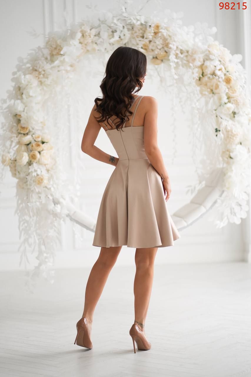 Атласна сукня з довжиною вище колін, розкльошеною спідницею «сонце», з подвійними брителями