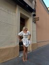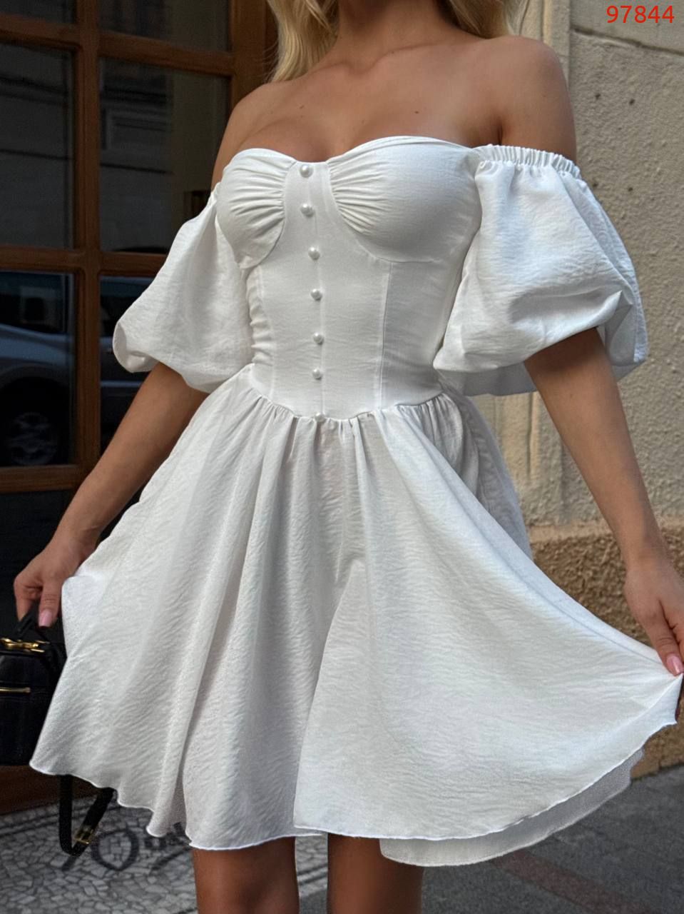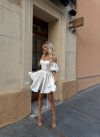 Модель стилізована обʼємним рукавчиком та пишною спідницею . Сукня має завʼязки на спинці, за допомогою яких можна регулювати обьєм декольте