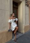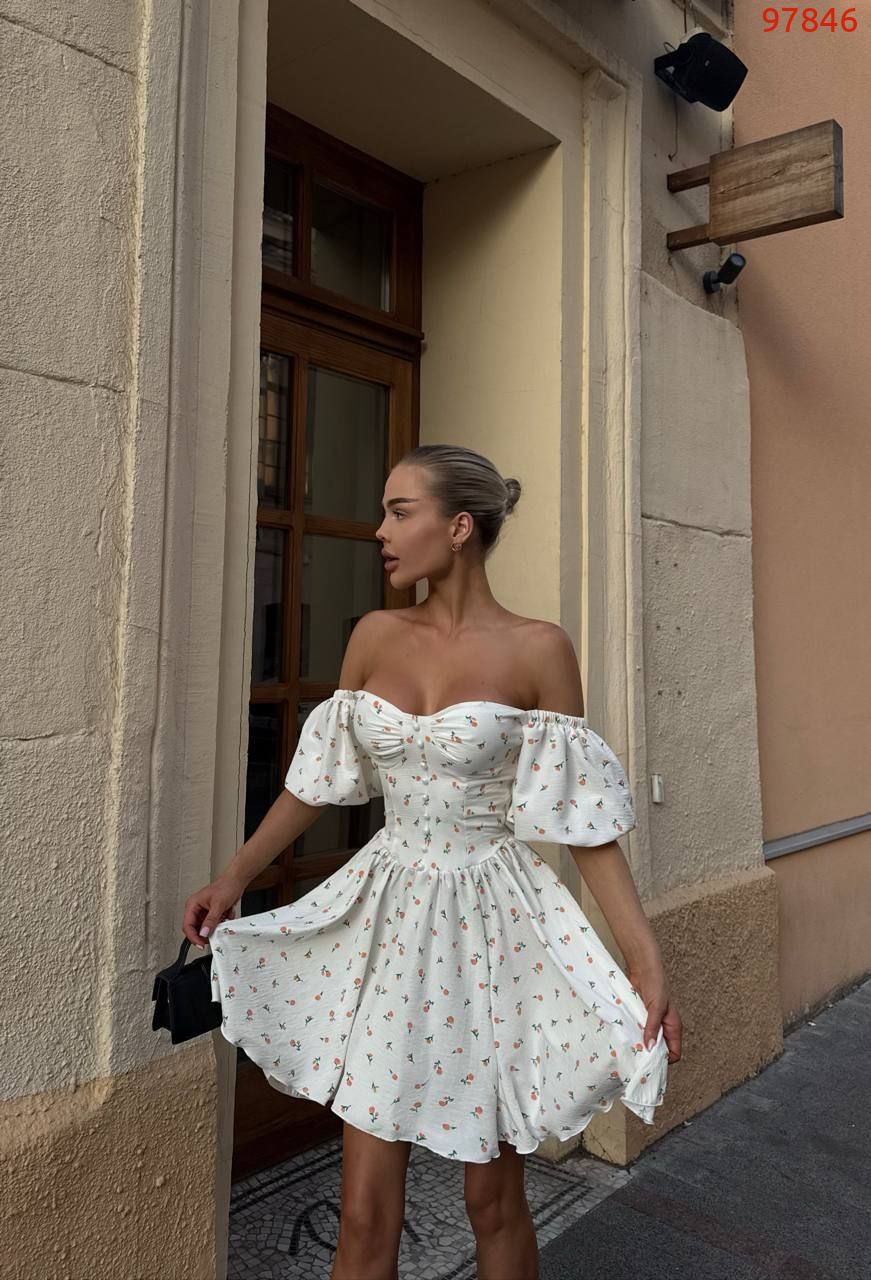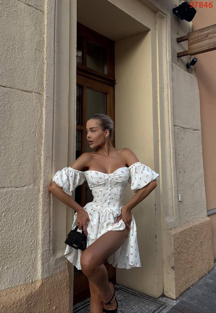 Модель стилізована обʼємним рукавчиком та пишною спідницею . Сукня має завʼязки на спинці, за допомогою яких можна регулювати обьєм декольте