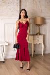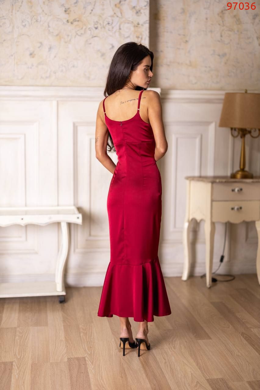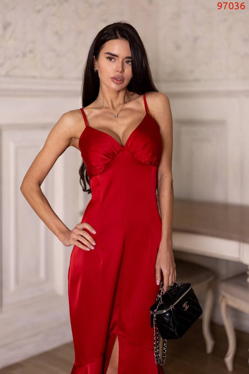 Легкий розкльошений низ із кокетливим розрізом додає образу руху та легкої чуттєвості, а м’який сатиновий блиск тканини робить сукню ідеальним вибором для свята, вечора у ресторані чи зйомки.