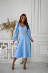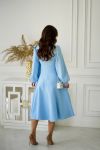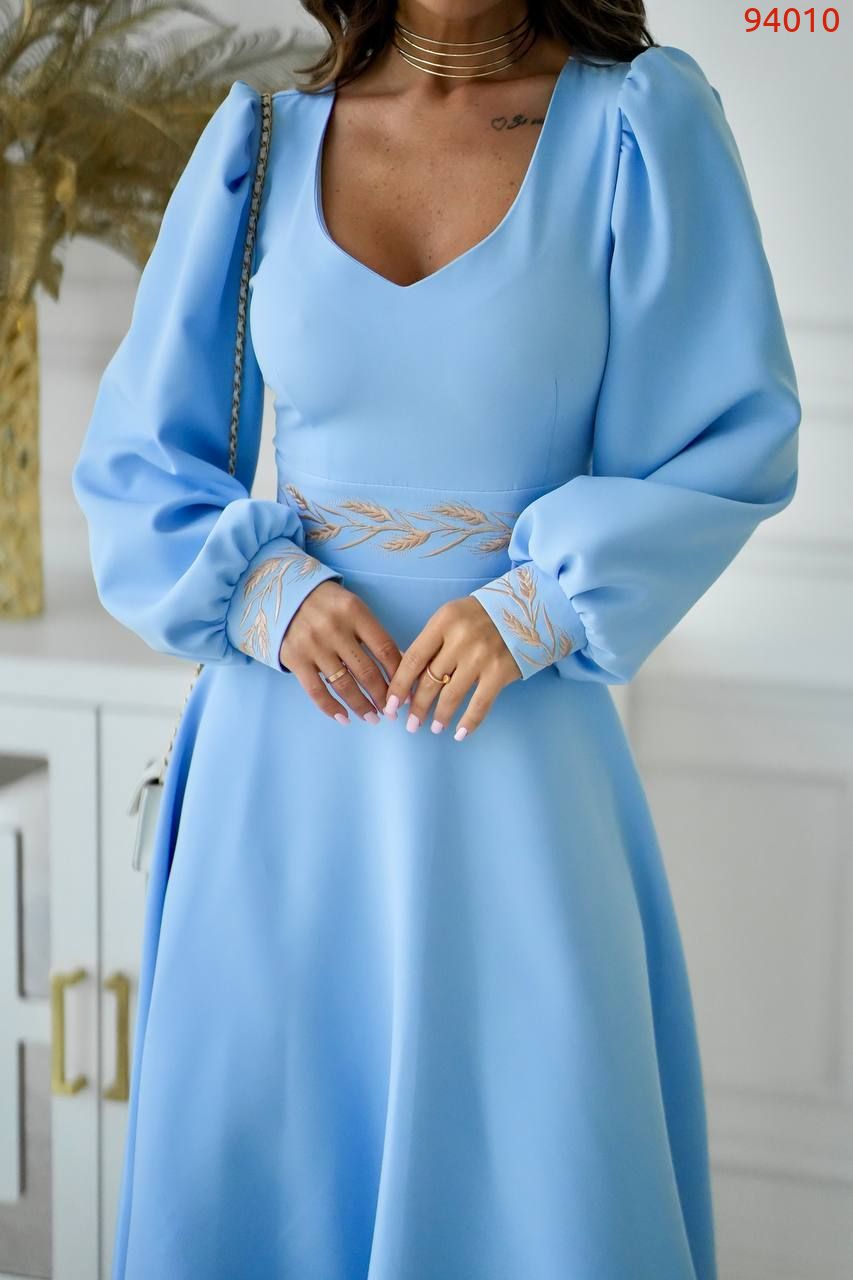 Вишукана сукня довжини міді з контрастною вишивкою на талії та манжетах. Глибокий V-подібний виріз візуально подовжує шию та додає образу нотку романтичності, а довгі рукави з легким об’ємом надають м'якості та плавності лініям.