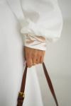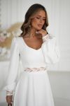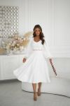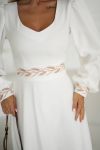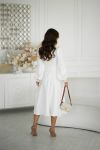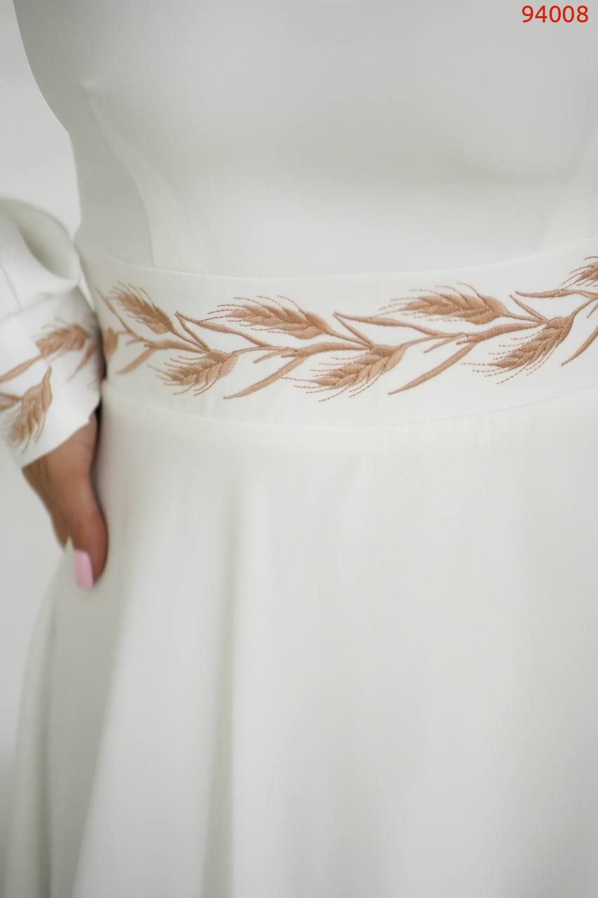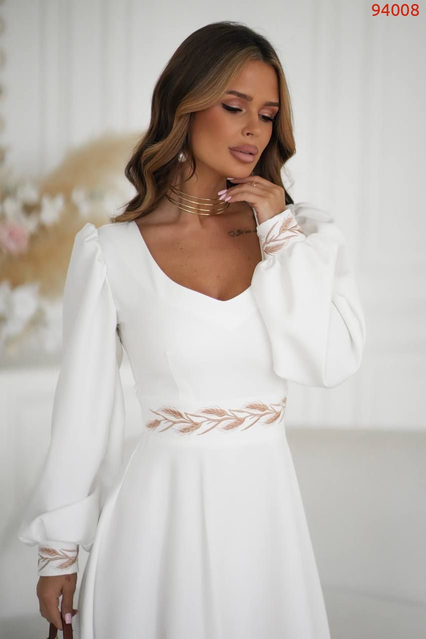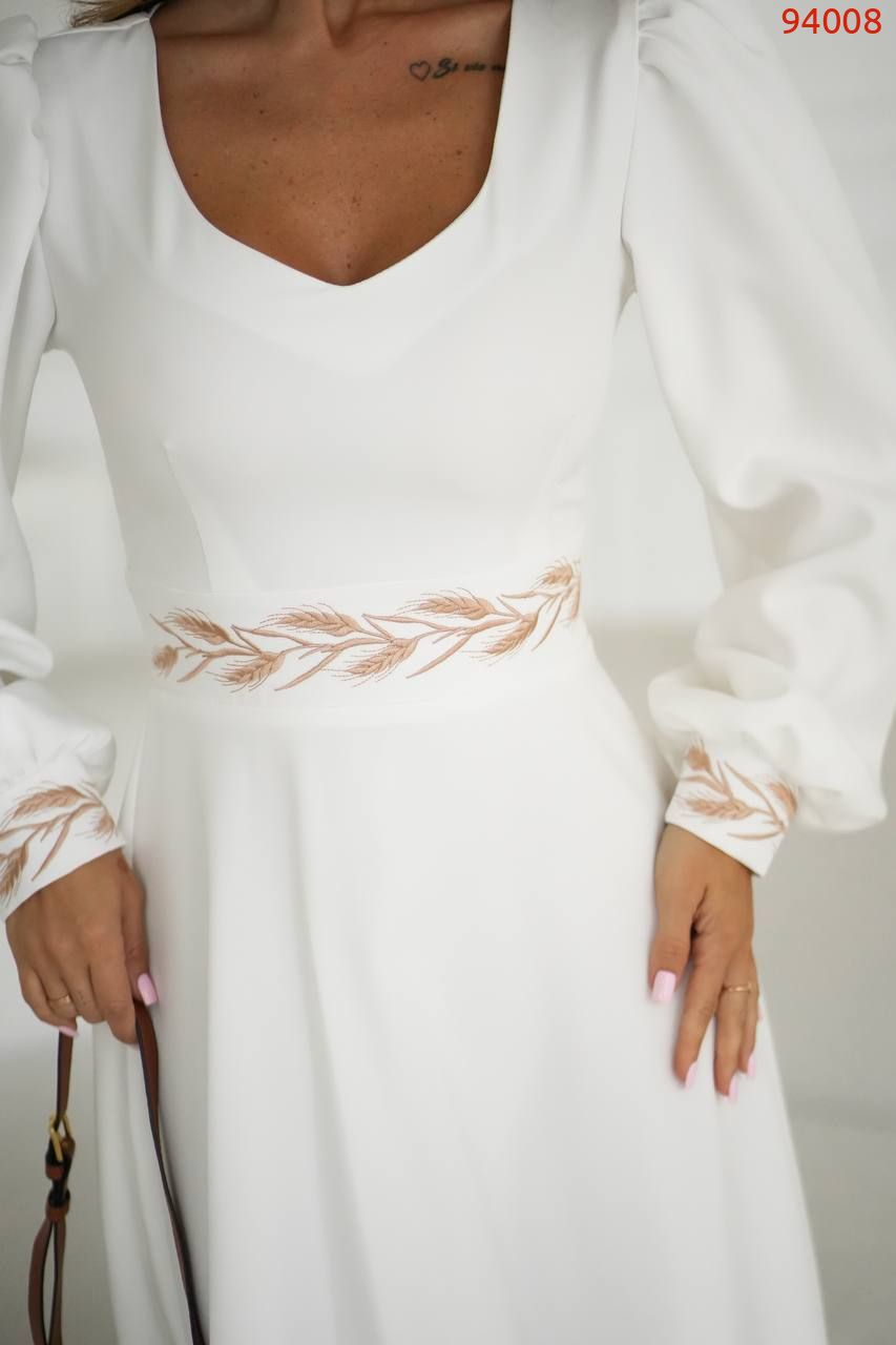 Вишукана сукня довжини міді з контрастною вишивкою на талії та манжетах. Глибокий V-подібний виріз візуально подовжує шию та додає образу нотку романтичності, а довгі рукави з легким об’ємом надають м'якості та плавності лініям.