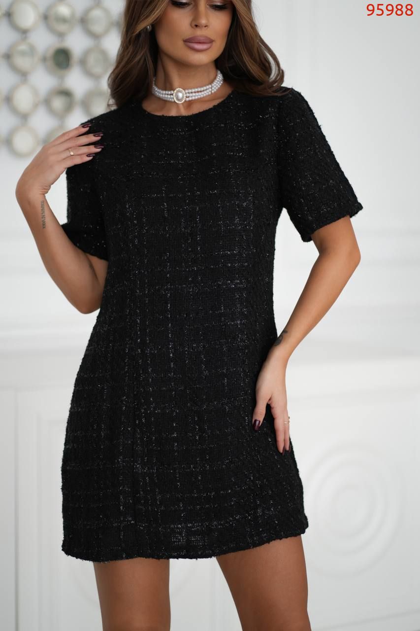Елегантна сукня прямого силуету, виконана з преміального твіду з ніжним мерехтінням люрексу. Тканина прекрасно тримає форму, створюючи акуратний та витончений образ.