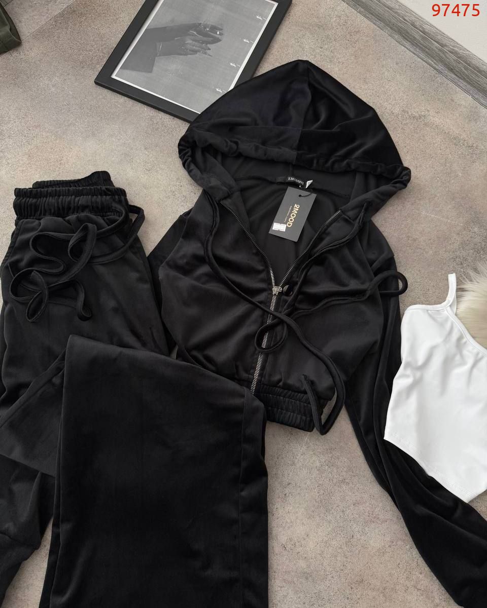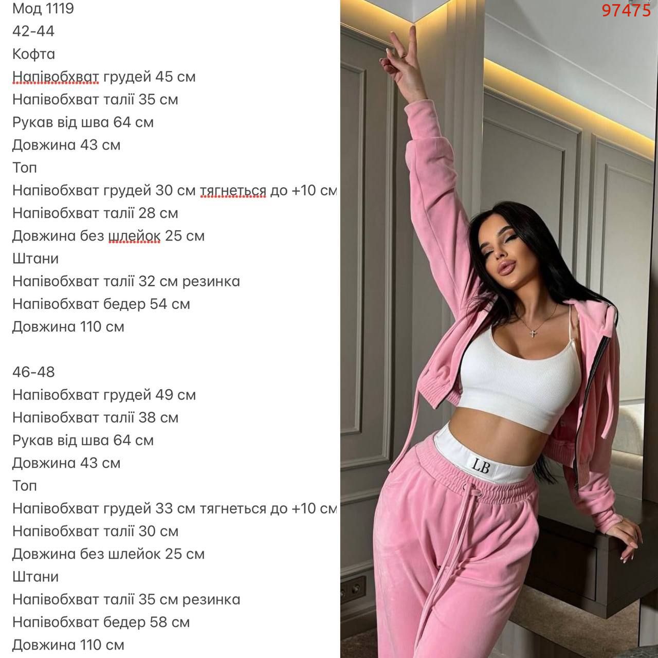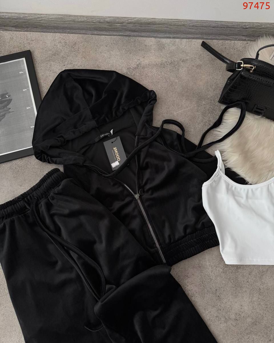 Дуже практичний костюм з кофти, штанів та топу - ідеально до будь-якого сезону. Приємна мʼяка тканина. Кофта на змійці та з капюшоном. Штани на резинці та мають кармани. Топ на бретелях, тягнеться по фігурі.