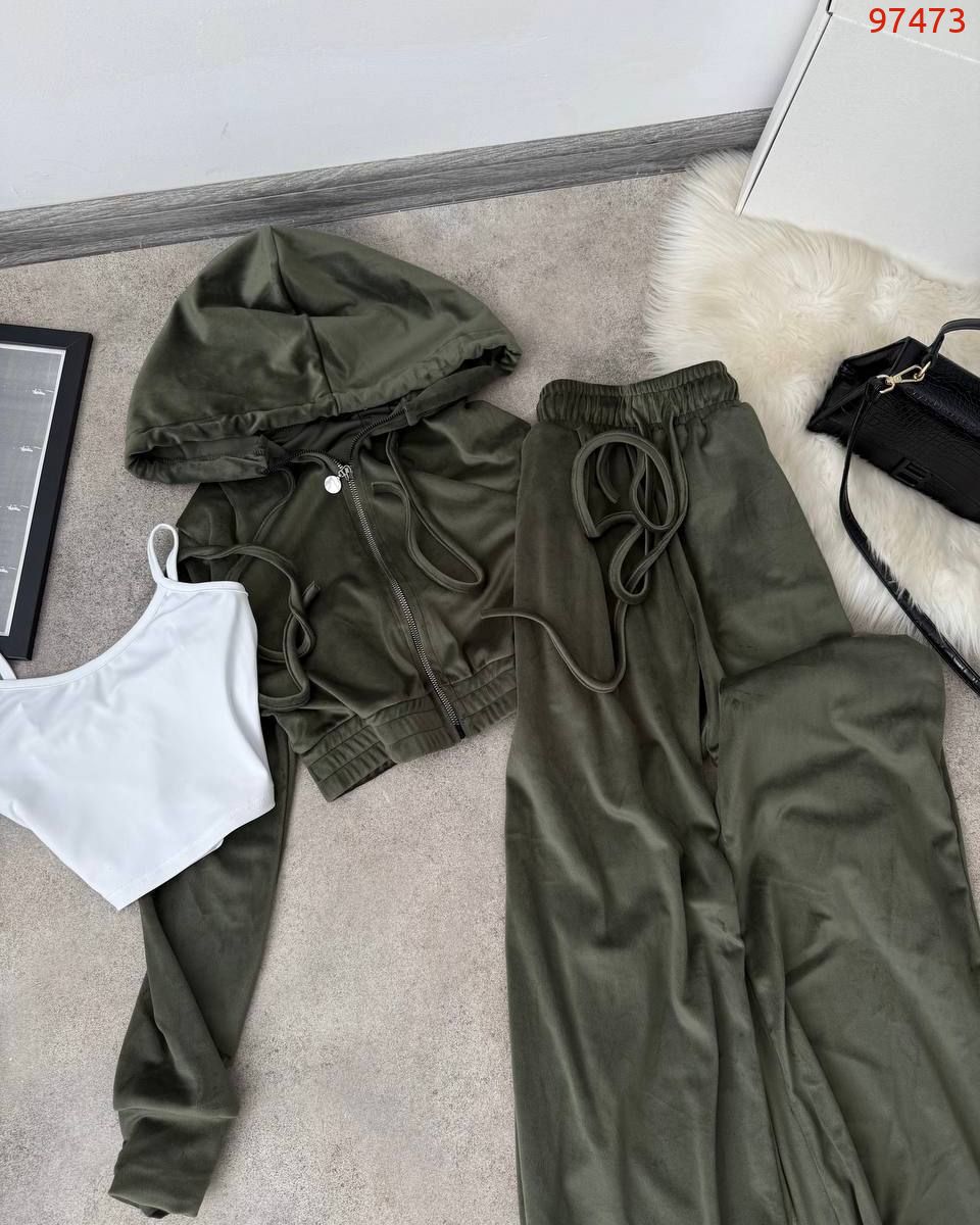 Дуже практичний костюм з кофти, штанів та топу - ідеально до будь-якого сезону. Приємна мʼяка тканина. Кофта на змійці та з капюшоном. Штани на резинці та мають кармани. Топ на бретелях, тягнеться по фігурі.